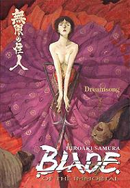 Blade of the Immortal 03: Dreamsong In their quest to hunt down and kill Anotsu Manji and Rin discover he will be traveling to Edo and will pass through an outlying town on his way. They decide to stake the town out and wait for him. While waiting they encounter another of Anotsu's pupils, Makie Otomo-Tachibana, who is masquerading as a geisha. She lures Manji into an alley for a little attention which royally pisses Rin off, who like Kagome and Inu Yasha or another other anime relationship, like one another but never fully admit it. Well she tries to kill Manji but he easily defeats her. She takes off and does some serious soul searching. Here comes a change from most stories, most of the manga centers around Makie, the person we should see as the villain. She humilated her older brother in sword fighting, this disgraced the family and her father threw Makie and her mother to the street. It was here she met up with Anotsu when she saved him from a pack of vicious dogs. She is torn between Anotsu and her love for him, and the urge to lead a simple life playing her guitar. In the end she chooses and goes to pick another fight with Manji. This time she beats him up, down, left, right, and sideways. She soundly defeats Manji, cutting his arm and leg off. He is only spared by Rin. Makie questions Rin's motives on pursuing this revenge, her life as a swordswoman and assassin was nothing but revenge against her father. She decides Rin is committed and her revenge is better than hers. She leaves Manji and goes on her way. This is a really singular manga, I've never seen a manga where 75 percent of the manga is nothing but villain's background and motive and it is tragic and very sympathetic and then she survives at the end of the manga, again normally this doesn't happen. Usually the hero cuts the villain down and they are happy to be released from the pain of their sins but she survives and goes on her way. Will she return? Will she be with Anotsu? Will she leave Anotsu? This is another strength of the manga, it leaves a lot of good questions to be answered in later manga. This is another great Blade of the Immortal manga and one of my favorites. |