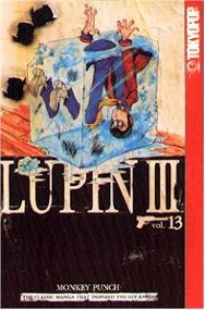 Lupin III Volume 13 This volume is Lupin vs Rasputin, a con man who has amassed a fortune that is nearly as much as Lupin. The pair start slugging it out trying to out con the other. After Lupin defeats Rasputin, of course he does, he is Lupin after all, we get a Goemon centered episode. A man has killed Goemon's uncle and then turned himself in so he could escape the wrath of the vengeful swordsman. Lupin helps Goemon get his revenge after a rather funny court scene. Then Lupin goes into a strange series of cave mazes trying to find a treasure that no one has ever seen. The entire series of mazes are filled with numerous booby traps that Lupin keeps stumbling over with humorus results. Like the episode of the Red Jacket (Second Series) where Lupin, Jigen, and Goemon go into the secret passage that leds to the Voodoo Temple (Curse of Jumbo JuJu or the Great Caribbean Adventure) these are so eeriely similar to the opening of Raiders of the Lost Ark, maybe Spielburg was borrowing just a little from Monkey Punch? Maybe. |