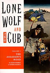 Lone Wolf and Cub 01 The Assassin's Road This is possibly one of the longest running mangas in the country today. 26 manga and still counting. It follows the bloody adventures of Lone Wolf, a ronin killing machine and his kid. My first thought is that watching his old man slice and dice all kinds of people is probably not a health upbringing for the kid. The stories are meticulous and so precise that it could have been written during the feudal age of Japan. Each episode is pretty straight forward, Lone Wolf has to kill someone and by the end of each episode the person is very dead. This first manga has no recurring characters other than Lone Wolf and his Cub. The only problem is each manga is so damn small. The thing doesn't fit well on a bookcase, and the pictures are rather small. But that is the only flaw that this manga has. |