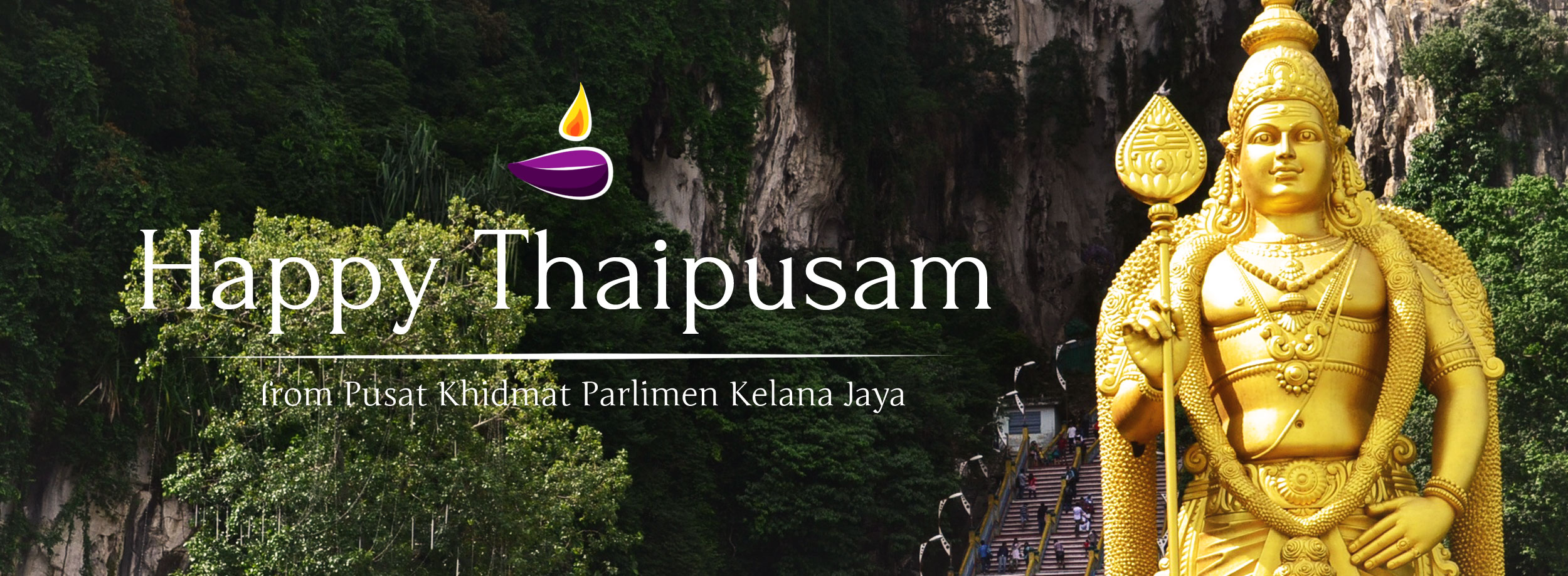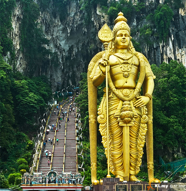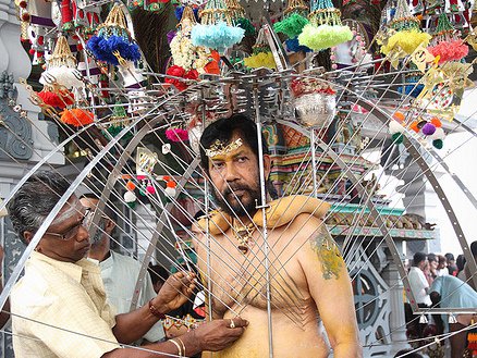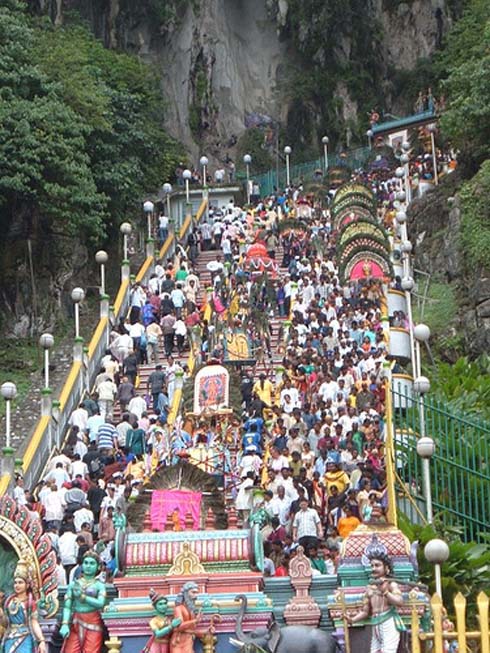 This festival falls on a full moon. The walk to the Batu Caves is the most important element of the celebration. Some devotees will carry large milk pots and ornate frames (kavadi). The kavadi are supported by a series of spikes that laterally pierce the skin of their chest and backs as a symbol of penance. Upon reaching the caves, devotees are greeted by a 42.7 m statue of Lord Muragan. Many
