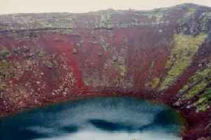 A volcanic crater with a lake at the bottom