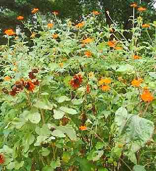 Mexican sunflower (tithonia). An annual started from seed sown directly in the ground. The plants grow 8 feet tall and are loaded with brilliant orange flowers that the butterflies love. The red flower is from a regular sunflower plant.