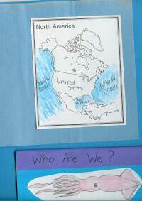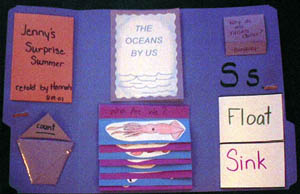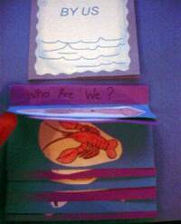 Shows the center bottom layered book of aquatic animals entitled "Who Are We?". Each layer has a colored picture of a creature, when lifted the name of the creature is on the back. We took this opportunity to learn the names of some rather strange animals! (Angler fish, squid, hammerhead shark, lobster, etc.) Above that you can see the front of a half-book entitled "The Oceans Around Us." |