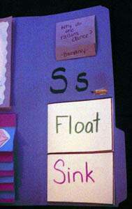 Shows the right hand side of the lapbook opened up. The top shows a matchbook on the "Dancing Raisins" experiment we did this week to show buoyancy. "S" was our letter sound of the week. and Below is a book with two flaps, Float & Sink, where we listed the objects we tested for buoyancy in a second experiment we did on the topic. |