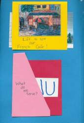 Open up the center flap. The backside of this flap looks like this. The yellow has an image from the internet of an outdoor cafe. Below is a pink "menu holder" with a red "menu" inside that holds what our French cafe served. My daughter wrote M-E-N-U on the front in capital letters for part of her handwriting lesson that day. |