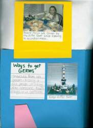 Lift the yellow cafe image and under it is a photo of my daughter eating dinner one evening at our "French Cafe!" She really enjoyed this meal, as did the rest of us! Additionally, to the left is a small list she narrated to me of ways a person can get germs. To the right is a photo of the Eiffel Tower we made from Lego blocks. |