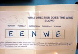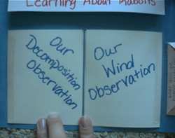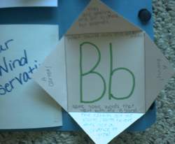 Shows the science section. We went for a nature walk and charted the wind direction. Made a windsock from a lunch-size paper bag and streamers cut from a plastic grocery bag. Decorated the windsock and hung it out for our wind observations. |