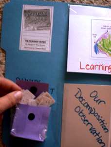 Science section opened up. It is two index cards put together into a shutter-fold. Left side is from our nature walk and states what we saw. Right side is our chart of the wind direction we charted for the week. |