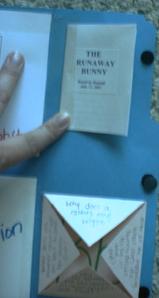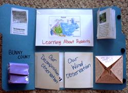 Right side of lapbook opened up. Top shows a small book we made. First we sequenced images of scenes from the book, then she "read" the book to me while I wrote her narration down. Then I typed it up and we pasted it all into the book. Below is a Corner-fold answer/questions about rabbits and story. Answers on the inside of the flip-ups.