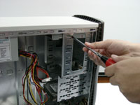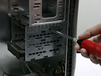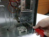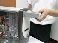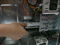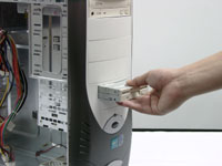 ทำเช่นเดียวกันกับการติดตั้ง CD-ROM แต่ให้ใส่ในช่องขนาดเล็กด้านล่าง ( อาจมี Case บางตัว ต้องใส่ Floppy Disk Drive จากด้านหลังเนื่องจากด้านหน้าเป็นหน้ากากทึบ