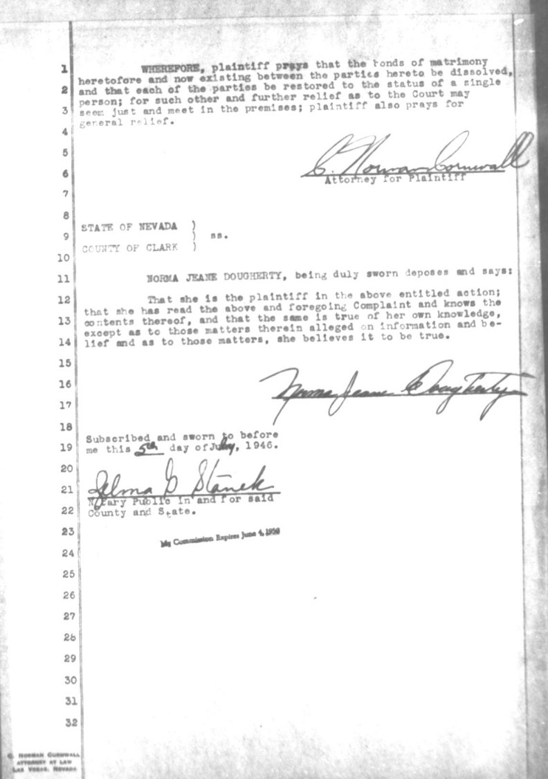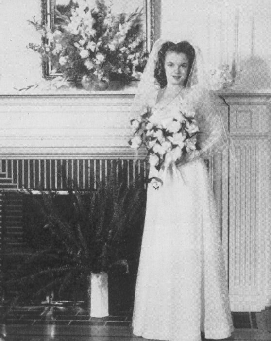 Norma Jeane got married to Jim Dougherty on June 19 1942 at 8:30pm. She wore a beautiful wedding dress that had been made for her by Ana Lower. She made a beautiful bride and although her mother wasn't present she didn't refer to the fact or seem unduly concerned. Her beloved Aunt Ana Lower gave her away.
