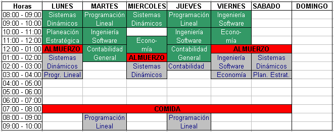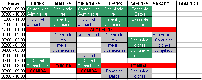 Pero supongamos que al mismo tiempo Pablo, el cual tiene un semestre de esos bien complicados, por la dificultad general de las materias, determina planear 46 horas semanales de estudio (24 horas de clase y 22 horas de estudio privado), y le da la siguiente prioridad a las materias: Control por Computador 5 horas, Compiladores 5 horas, Comunicaciones 4 horas, Investigación de Operaciones 4 horas, Bases de Datos 3 horas, Contabilidad 1 hora. Entonces su horario podría tomar la siguiente forma: