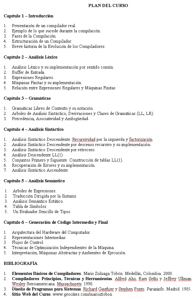 Este curso difiere de aquellos cursos "normales" ya que no sólo se da un descripción teórica de los conceptos subyacentes en el funcionamiento y diseño de un compilador, sino que también usted tendrá la oportunidad de escribir un compilador para un subconjunto representativo de las principales características de los lenguajes de programación de alto nivel (y en español !!!). Este subconjunto está relacionado en el Apéndice B del Texto Guía. Por lo tanto, este curso incluirá una cantidad substancial de programación para ver en funcionamiento los conceptos teóricos, y por lo tanto debe poseer conocimientos suficientes en Pascal o C/C++.