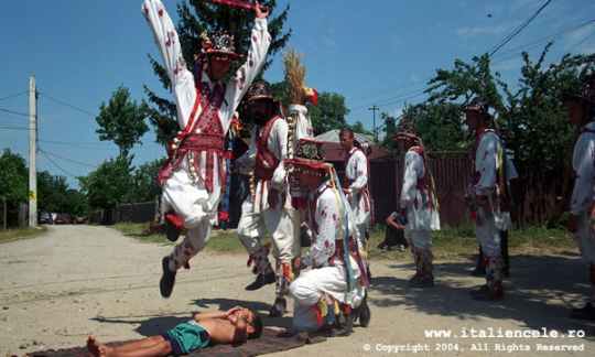 | Lenuta vrea, nu, nu vrea, e sigura ca se va marita cuun soldat american. Asa cum l-a visat, sosit in sat si nestiind pe care ulita s-o ia. "Trebuie sa punem un indicator" vine prompt replica Eugeniei. Este amestecul real de poezie si umor spontan asa cum il intalnim la fiecare pas. Suna mobilul, pentru ca asa este, telefonul mobil este de mult o prezenta serioasa in satul romanesc, alaturi de calculator, video si cate mai inseamna o discoteca. Giovanni este cel carei-a promis Eugeniei c-o va duce in Spania sa castige 500 de euro si nu 50 cate ajutorul de somaj aici. Si brusc apare si ideea: sa invete ea Lenuta spaniola pana la noapte ca soldati americani sunt si in Spania... E o evadare din curtea parinteasca, numai ca aparent indreptatita facand o comparatie cu fuga baietilor lui Moromete. Tatal fetelor este tipul de barbat mai degraba prezent la carciuma decat la munca, dar cu atitudine de stapan care se ocupa numai de lucruri importante. Asa ca fetele il vad intorcandu-se acasa si cazand beat de pe bicicleta, sau intorcandu-se din nou la carciuma pentru a o lua de la capat. Altcineva este cel care se opune plecarii lor. Mutul. Mutul calusarilor. Gigel isi face curaj si, punandu-si straie femeiesti, inclusiv sutienul subtilizat al Eugeniei, rosteste juramantul de a nu vorbi 40 de zile, de a nu se atinge de 'muiere' in tot acest timp. Calusarii au nevoie de mut pentru ca asa e datina si nu indraznesc s-o incalce. Batranii satului, rezemati in ciomag pe banci pe langa porti, ("In ce an suntem, mosule, trecuram de doua mii?") vegheaza la respectarea obiceiurilor. |