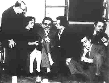الماغوط جالساً (الى اليمين) في احدى جلسات <<شعر>> والى جانبه يوسف الخال،