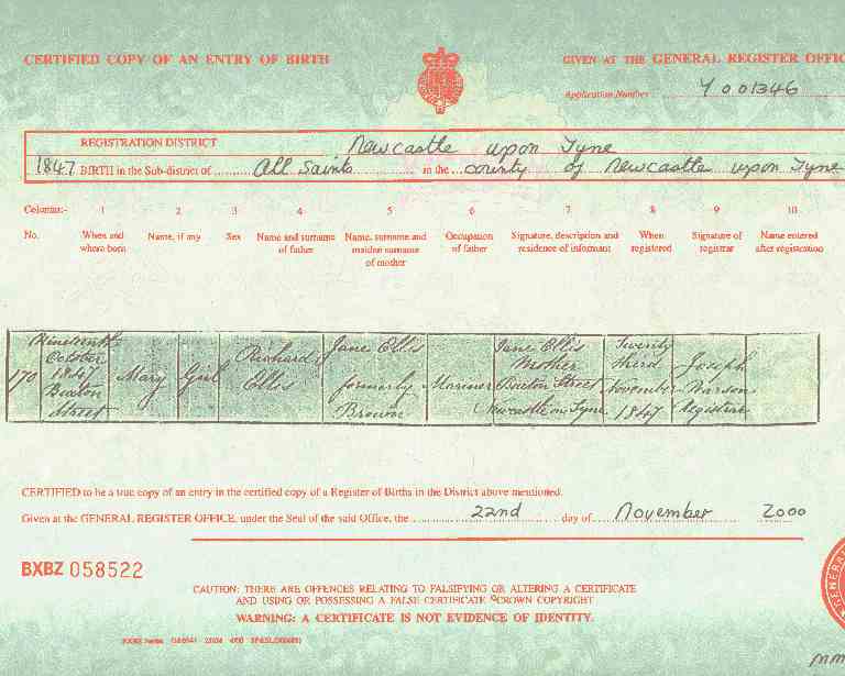 | BIRTH: | 12 October 1847 - Dog Bank, Newcastle |