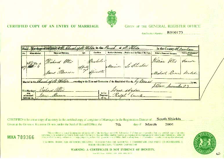 ![]() Richard and Jane's marriage certificate. |