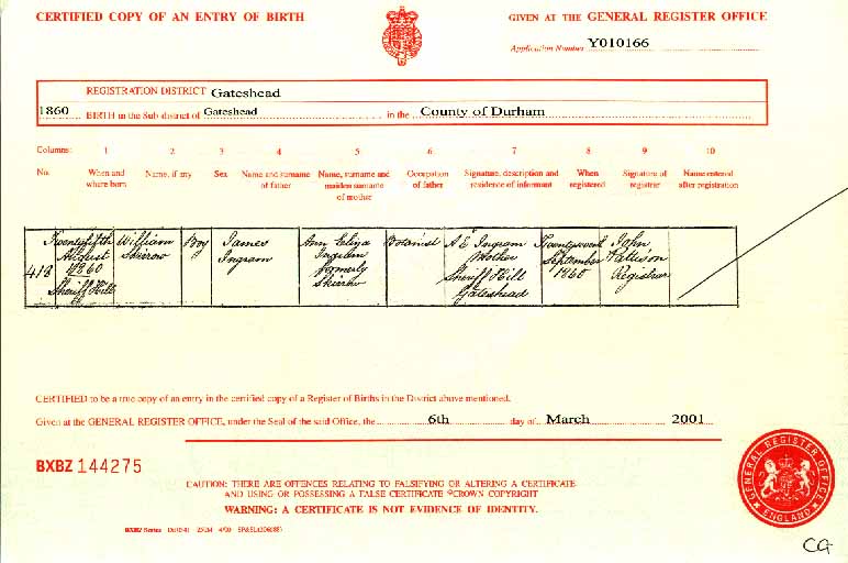 William was born on 25 August 1860 in Sheriff Hill, Gateshead. He was the son of James Ingram (a Botanist) and Ann Eliza Ingram (formerly Skirrow). Census records indicate he had two elder brothers, John Henry Ingram and Thomas Ingram and three younger brothers, Jas., Septimus and Aurthur. Shortly after his birth, the census of 1861 records William Skirrow Ingram as being the seven month old son of Ann Eliza Ingram. His mother is living with her husband's elderly parents, an eighty-year-old boarder, and her three sons. It is not clear where William's father, James, is living. By the time of the 1881 census William's mother has re-married to Francis Birkett and William lives with them and his three younger brothers in Queen Street, Ryhope. His stepfather was a coal miner from Scotland. On 27 March 1883 William marries Mary Davison in Sunderland. William lists his father's occupation as 'Traveller'. William's occupation is recorded at this time as 'Joiner'. Both he and his wife record their address as 83 Ryhope Street South, Ryhope, Sunderland. By the time of the 1891 census William is living with his wife, three daughters (Annie, Mary and Ellen) and his brother-in-law, Matthew Ingram. He still records his occupation as 'Joiner' and they still live at 83 Ryhope Street South. In 1894 they are living at the co-operative buildings, Ryhope and have their first son whom they call William. William (Snr) records his occupation as 'Joiner Journeyman'. By the time of the 1901 census William lives with his wife, five daughters, two sons and a German boarder called Martin Lillig, who records his occupation as 'Pork Butcher'. William still records his occupation as 'Joiner' and they still live in the co-operative buildings, Ryhope.