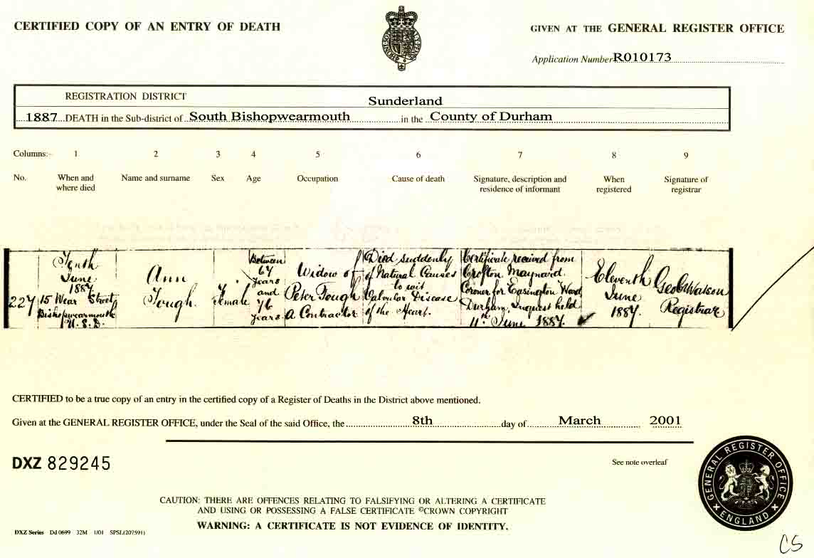 Ann Keith was christened on 28 December 1811, in the parish of Saint Nicholas, Aberdeen. She was the sixth of nine children. Her siblings were, Elspet, Elesebeth, Margaret, Jean, Thomas, Euphemia, Helen and Richard, all born between 1804 and 1825. Elspet was first and was christened in Saint Nicholas in 1804. The next two were christened together in Old Machar in 1806 and appear as if they could be twins. The remaining children were all christened in Saint Nicholas. It is not clear whether the family moved to Old Machar, or for some reason, merely had two daughters christened there. In 1833 she married Peter Tough in the Parish of Saint Nicholas and they went on to have at least three sons; James, John and Alexander. Their son, Alexander, departed to the North East of England in or around 1856 and married. I always assumed Peter and Ann remained in Aberdeen but I have found reference to them in the 1881 census living at the Union Workhouse in Skipton, Yorkshire. Therefore, it is probably fair to say that they was quite poor. Her husband, Peter, died in 1883 at the workhouse. Ann then moved to Sunderland to live near her son, Alexander, and his family. A few years later she died in Sunderland. The death certificate records that she "died suddenly of natural causes, to wit Valvular Disease of the Heart." Valvular Disease of the Heart is described in Webster's 1913 dictionary as