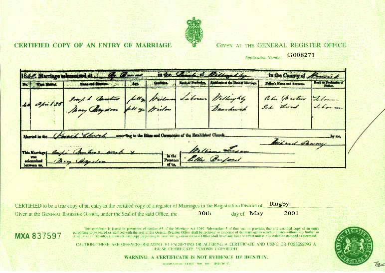 | BIRTH: | 7 January 1802 (christened) - Willoughby, Nr Rugby, Warwickshire |
