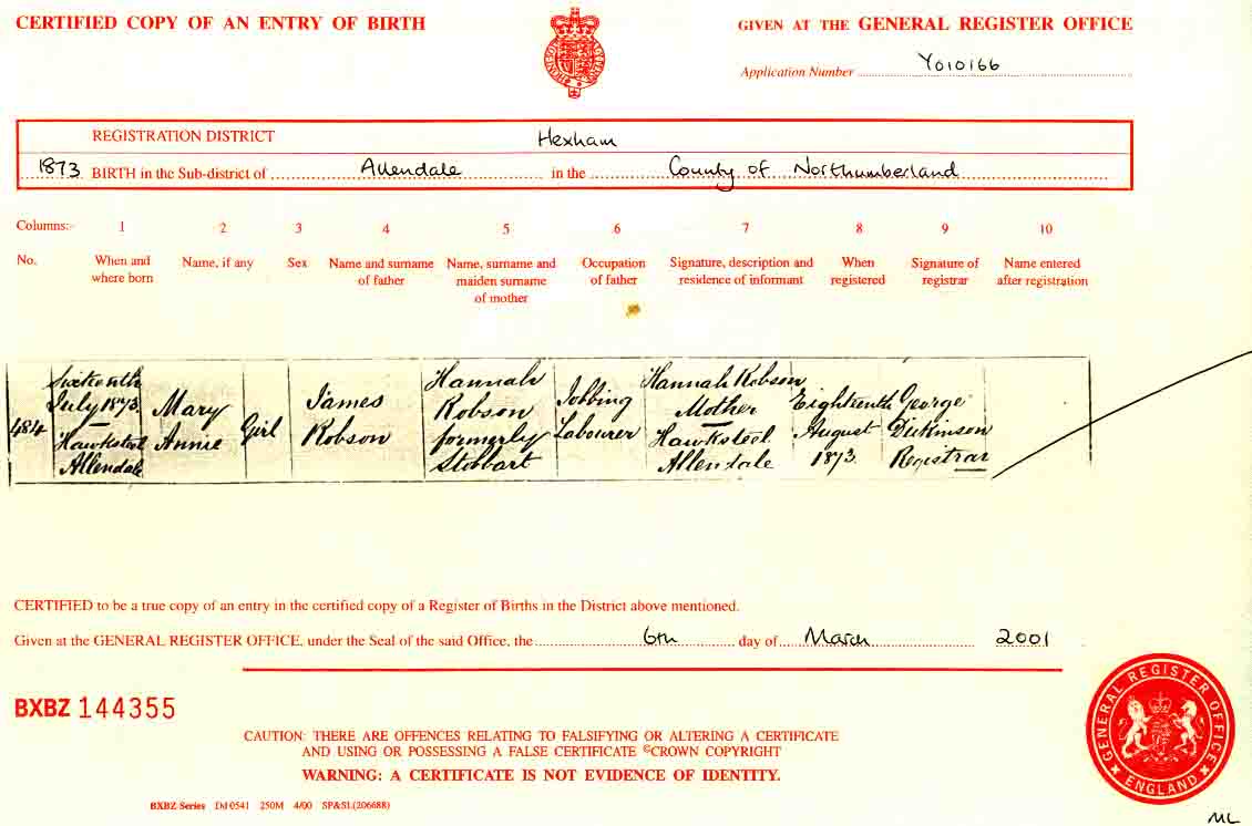 | BIRTH: | 16 July 1873 - Hawksteel, Allendale, Northumberland |