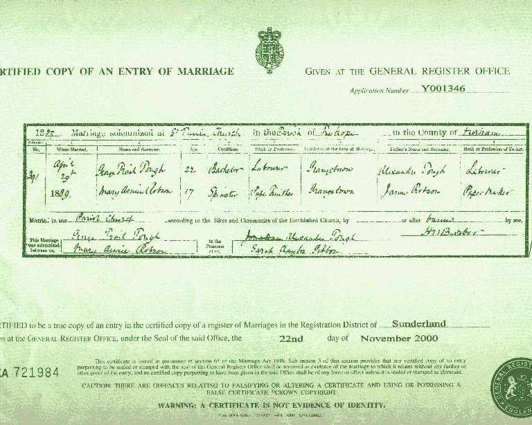 | MARRIAGE: | 29 April 1889 - Ryhope, Sunderland |