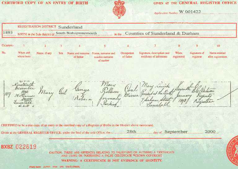 ![]() Mary Robson's Birth Certificate |