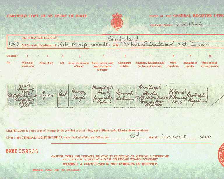 | BIRTH: | 9 January 1896 - Grangetown, Sunderland |