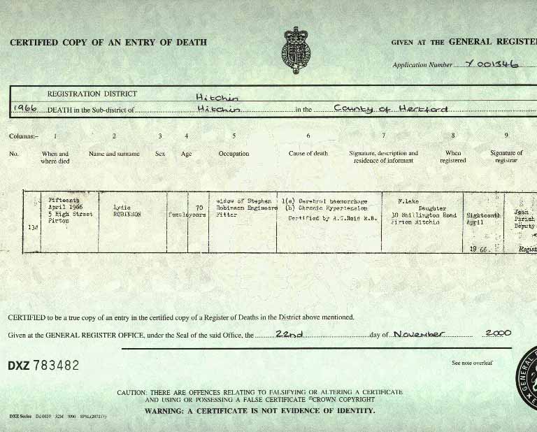 | DEATH: | 15 April 1966 - Pirton, Near Hitchin, Hertforshire |