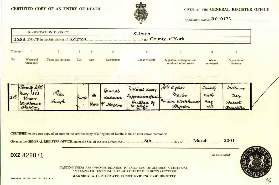 Peter Tough was born between 1803 and 1805, probably in Aberdeen, Scotland. He married Ann Keith in Saint Nicholas Parish, Aberdeen on 21 December 1833. They had at least three sons; John, Alexander and James all christened in Skene Parish, Aberdeen between 1834 and 1837. The Parish of Skene christened over twenty Tough children between 1818 and 1870, many of whom were probably cousins and second cousins of John, Alexander and James. It is unclear who Peter's parents were. Peter's second son, Alexander, departed to the North East of England in or around 1856 and married. I always assumed Peter and Ann remained in Aberdeen but I have found reference to them in the 1881 census living at the Union Workhouse in Skipton, Yorkshire. The Master of the house was John Ogden. He was listed as a general labourer but I think it is fair to say they were quite poor. Peter died on 25 May 1883 at the workhouse. The death certificate records the death due to "natural decay, suppression of urine". Webster's 1913 dictionary describes "suppression of urine" as