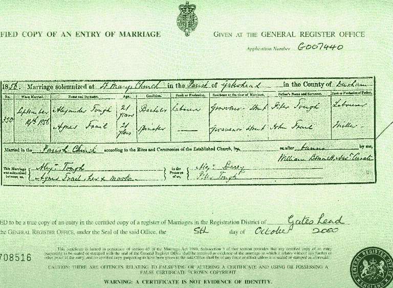 Agnes was born in around 1835, probably in Aberdeen. Her father was John Trail, I don't know who her mother was. At some point before she was married she left Aberdeen to live in the North-East of England. On 14 September 1856 she married Alexander Tough in St Mary's Parish Church, Gateshead. At this time Alexander's occupation was recorded as labourer. Agnes was also from Aberdeen but I am not sure if they came to Gateshead together or whether both families re-located to the North-East at a similar time. Alexander and Agnes were recorded as living at the same address on the marriage certificate. Alexander's parents were living in England in 1881 so it is possible that they all moved together, probably in the 1850's. Alexander and Agnes had four known children; James Tough (b.1860), Jane Ann Tough (b.1862), George Tough (b.1866) and Alexander Tough (b.1868). Alexander and Agnes are recorded in the 1901 census as living in Sunderland at the age of 65. I don't know when either died. |