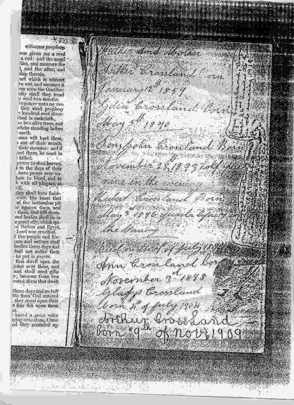 Ann (or "Nanny" as she seems to have always been called) was born on 27 December 1816, in Barnsley, Yorkshire. Her parents were Samuel and Elizabeth Townend and she had five sisters and one brother. In 1834 she marries John Crossland and they go on to have fifteen children though mainly as a result of T.B. they outlived many of them. Their first child, Charles only lives to the age of 55 before dying of T.B. in 1890. Their second child, Robert, died at the age of 21 in 1858. Their third child Harriet lived to one week short of her 87th birthday before dying in 1925. However, her husband died prematurely in 1873. Their fourth child, Hannah, was the longest living, finally dying at the age of 100 in June 1940. However, their seventh child, Emma, and twelfth child, Ann, both died before reaching their first birthdays. All censuses record Ann's husband, John, as a Linen Warehouseman. William Bayldon owned a Linen Manufacturers in George Yard, Barnsley and is listed in Baines's Directory and Gazzetteer Directory of 1822 and both Pigot's Directories of 1829 and 1834. They always appears to be living with their large family, often including their children's wives and husbands and grandchildren. In the 1881 census they are recorded as living with their daughter (Harriet Crossland b.1838), their son and his wife (Sam and Eliza Crossland), and their grandchildren (Jane Robinson, Ann Robinson, Harriet Robinson, Elizabeth Robinson and Andrew Crossland). On 25 March 1887 John dies closely followed by his wife, 14 months later. They are both buried in Barnsley Cemetary in Grave No. R567 19.8.1888. |