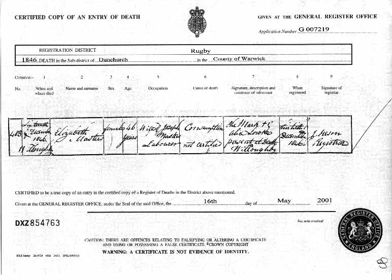![]() Elizabeth Masters' death certificate. |