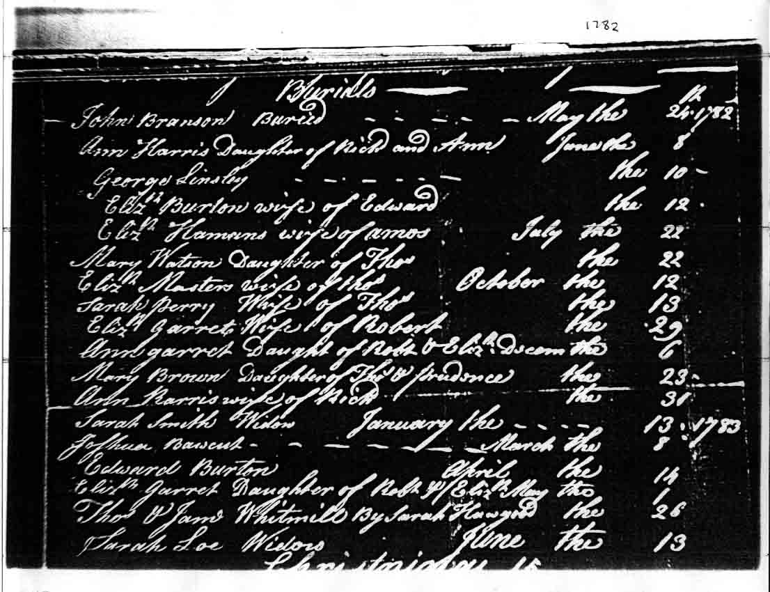 Elizabeth was born on 4 July 1736 in Welton, Northamptonshire. Her parents were Joshua and Elizabeth Wafforn (formerly Hill). She was the third of seven known children, her siblings being; Joseph (b.1927), John (b.1730), Joshua (b.1738), James (b.1741), Frances (b.1744) and Mary (b.1748). On 31 October 1755 Elizabeth marries Thomas Masters and they go on to have at least seven children; Elizabeth (b.1757), Thomas (b.1760), John (b.1762), Ann (b.1765), Mary (b.1769), Joseph (b.1772) and William (b.1775). Elizabeth, dies on 19 October 1782 at approximately forty three years of age leaving Thomas to raise the family by himself. Their children would have been aged as follows; Elizabeth - 25, Thomas - 22, John - 20, Ann - 17, Mary - 13, Joseph - 10 and William - 7. However, Elizabeth and Thomas had left the family home to marry so it is expected that John and Ann may have taken on a lot of responsibilities for the running of the household till their father re-married. |