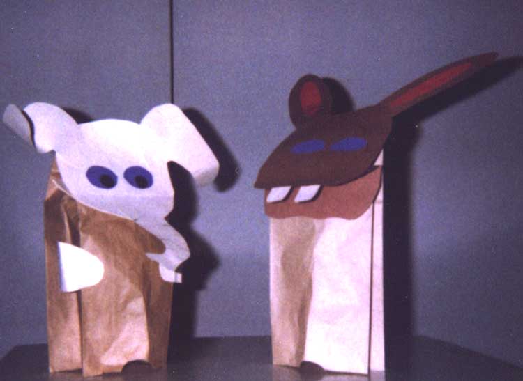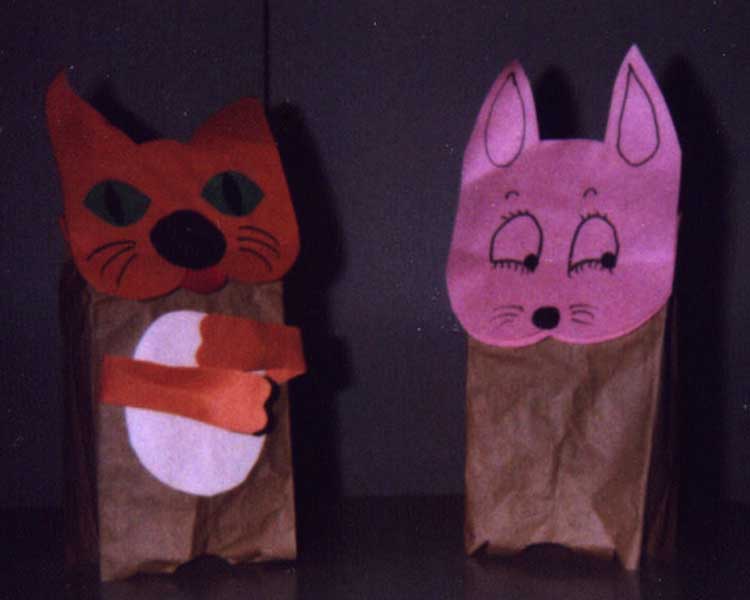| Today we're going to make Lunchbag Puppets, like the ones I have here. You can make your puppet anything you want--it can be an animal, a person, real or imaginary. But we're going to go through the first part--the actual putting-together of the puppets--all together. Even if you think you know how, try not to get ahead. | ![]() |
