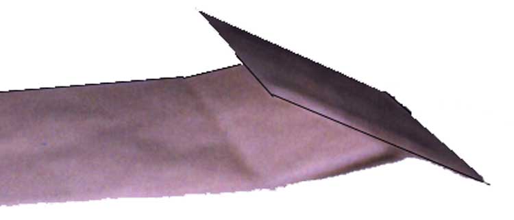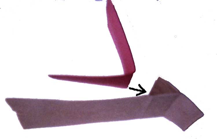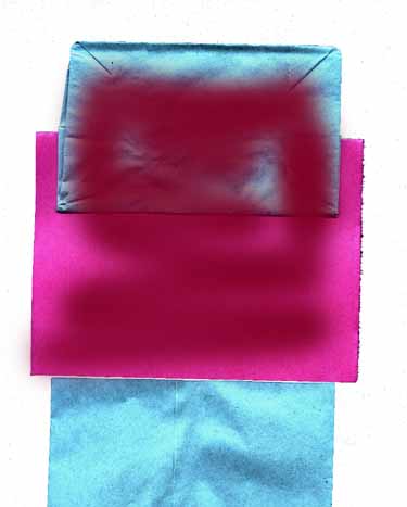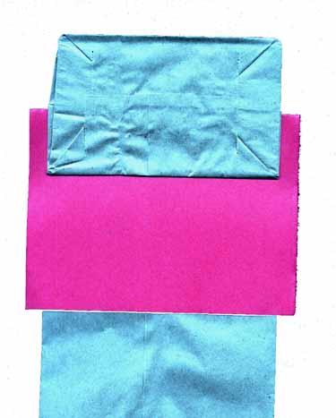 | Now take your folded piece of construction paper and fit the fold of the paper into the crease between the rectangles in the bag. Close the "mouth" down on the paper and press to set the glue. (Help whoever needs it. Many students will be tempted at this point to put their hands in their puppets and make the mouths go, but try to prevent it, because it is often difficult or impossible to get the bag folded flat again afterwards, and you'll need to.) | ![]() |
