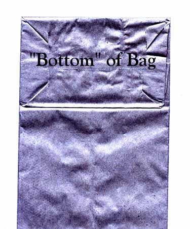| Take your lunchbag but don't open it up! Examine it until you have found the rectangle of paper that becomes the "bottom" of the bag when it is opened. (At this point I generally have to go around to everyone and make sure they have it right.) Place the bag on the desk so that the "bottom" of the bag is at the top and facing you. (Make sure everyone gets it.) | ![]() |