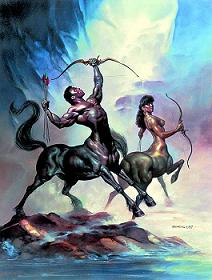 | The most famous centaurs are those from Greek mythology. In these myths, the centaurs were a race of creatures that were half man and half horse. They were sired by Ixion and a cloud. By definition, the centaur is a creature, half man and half horse. However, there are many variations of the centaur. Some had a human body terminating in human legs and feet with equine body and hind legs extended behind the waist. Another variation gave the centaur wings. Some times they have equine ears and sometimes they have both equine and human genitalia. Other variations include the onocentaur, bucentaur, and leontocentaurs. Aside from Chiron and to a lesser degree Pholos, the centaur population as a whole was associated with drunkenness and physical, especially sexual, violence. Nevertheless, the people of antiquity were too fond of horses to consider the union of horse and man as a degraded compound. In fact, the centaur is the only of the fancied monsters of this time to be given any good traits. Before the appearance of the Greek centaur there are earlier examples of man-horse creatures. For example, there are sculptures and tablets from the near east that pictured the centaur as guardian spirit. It is depicted as a hunter using a bow as it's principle weapon. After the Greek period it became a very popular symbol in art right through the middle ages, featured in the Bayeux Tapestry for example. The centaur from Greek myth can be found in Homer's Iliad and Odyssey, Apollodorus' Library, Ovid's Metamorphoses (book 12), Virgil's Aeneid (book 6), and Pausanias' Description of Greece |