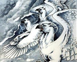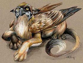 His forelegs are like those of a bird of prey, scaled and taloned, though much thicker in their bone structure. His large wings span twenty feet when he doesn't have them folded against his back. The thick feathers that cover the front half of his body give way to sleek fur at his middle, and his rear half is that of a lion. Gryphon is colored in nearly all earthtones, from the rich red-brown of his feathers to the sunset tawny fur of his lion half to the deep, liquid amber brown of his eyes. Only the golden scales of his forelegs and the warm orange-yellow of his beak break the rule. |