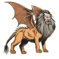 manticore n. 1 a fabulous monster having the body of a lion, the head of a man, porcupine's quills, and the tail or sting of a scorpion. 2 Heraldry a monster represented with the body of a beast of prey, the head of a man, sometimes with spiral or curved horns, and sometimes the feet of a dragon. [Latin manticora representing Greek mantikhoras, corrupt reading in Aristotle for martikhoras from an old Persian word for 'man-eater']" Manticore "A monstrous creature which inhabits the forests in Asia, especially in Indonesia, Malaysia and India. The manticore, considered to be the most dangerous predator in these regions, has the body of a lion and a head with human resemblances. The mouth is filled with three rows of razor-sharp teeth and the scaled tail ends in a ball with poisonous darts. The monster stalks through the forest in search of humans. Upon an encounter with a human, the manticore fires a volley of darts at the victim, who dies immediately. This unfortunate person is devoured completely; even the bones and clothing, as well as the possessions this person carried, vanish. When a villager has completely disappeared, this is considered proof of the presence of a manticore." |