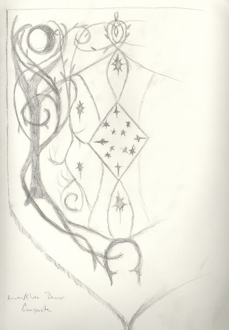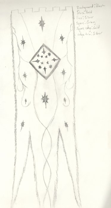| I almost didn't see this banner on my way out of the Boston Lord of the Rings Exhibit. It was hanging with a collection of others from the ceiling. Most of them were banners of Rohan which I had seen before. This one caught my eye, so I sketched it and then retouched the sketch later. The words denote the colors of the banner. Background: Black Stars: Gold Vines: Silver Square: Gray Square Edge: Gold Edge Trim: Silver Later I learne from AlleyCatScratch that this is Gil- Galad's banner as carried during the battle portrayed at the beginning of FOTR. One day when I was bored I also drew a composite banner of this and Arwen's bedroom banner. Tis nifti, I hope to make one of these at some point. |