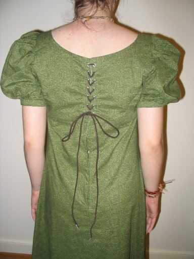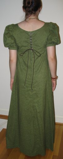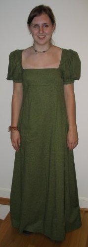 | This dress was made primarily to be worn with my spencer jacket, because none of my normal clothes worked perfectly with it. I used Butterick 6630 view A without the single eged eyelet fabric. I spent alot of time looking for the perfect fabric at a low price since I had already spent alot on the fabric for the Blood Red Gown this summer. I finally found this green calico at Jo-Ann's. This dress is fully lined with white muslin and closes with lacing and hook and eyes. This pattern was fantastic and it is so much fun to wear because the lining is so great. Unfortunately I do not actually have Regency undergarments, but if I really need the Regency "lift" I can take the straps off my pirate bodice and use that as a corset with my edwardian petticoat. |