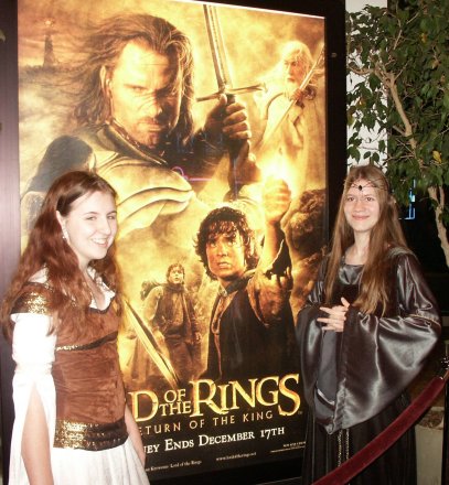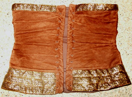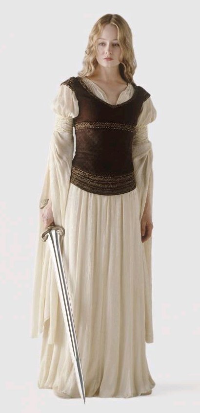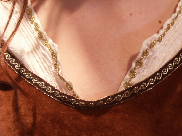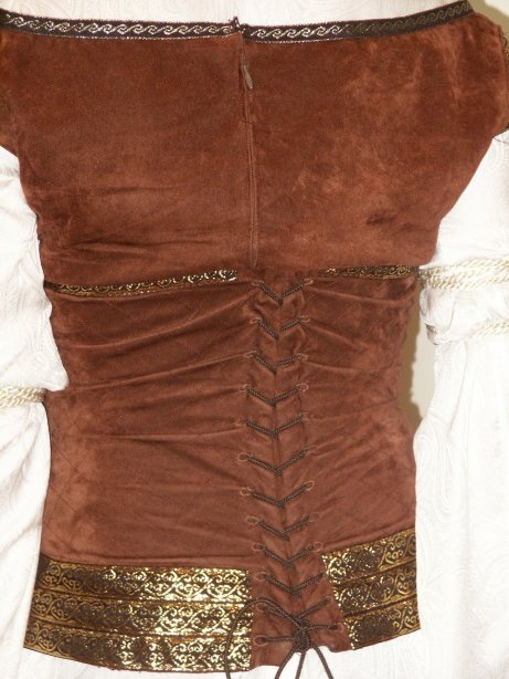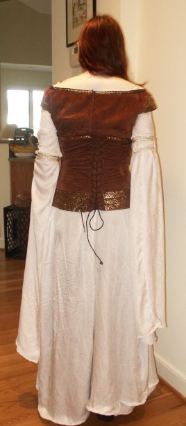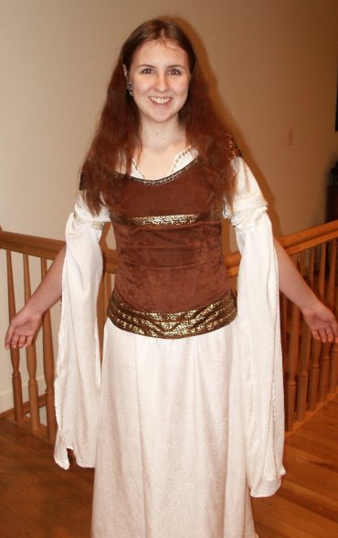 | I was inspired to make this dress after completing my Rennaissance outfit in August 2003. My goal: To finish this dress in time to go see ROTK at midnight in costume. Well, I did make my goal after a costuming experience that taught me many new things. The Corset: The first piece I tried was the corset. I found a chocolate brown courderoy at G Street Fabrics and used a pre-made corset pattern from Patterns for Theatrical Costumes by Katherine Strand Holkeboer, which I had picked up at the MET while in New York City (during the blackout, no less). Needless to say, the corset did not fit. After a couple of weeks' work, I had a corset for a 19 inch waist with ripped too-small hand sewn eyelets (my metal ones ripped out) and messy quilting. I was discouraged but not ready to give up. For my second attempt at the corset I used Katherine's Corset Drafting Instructions. This pattern fit me perfectly, thank goodness. I ordered a faux washable suede from www.warehousefabricsInc.com for my second attempt at the corset after seeing a picture of the dress in sunlight, showing that the corset was lighter in colour than it had originally appeared. I machine stiched the 1" diamond quilting into my corset pieces and lined it with cotton twill left over from the prelim. I used cased featherweight boning, which I am neverusing again because it bends very easily out of shape. I also handsewed my eyelights, having had the unfortunate experience of the metal ones popping out.I ordered my trim from Calontir Trims and handsewed it on. I laced the vest with a piece of dark brown bolo cord from G Street Fabrics. The finished corset fits me perfectly and the fact that it meets in the back just makes it easier for me to breathe. The Vest: For the vest I used Simplicity 9888, which I had purchased a couple years before and made the top once as well as two versions of the skirt. I chose not to line the vest, because this dress had already emptied my wallet and I prefered to make due without. I altered the neckline of the pattern to match the SM vest neckline, though mine does go a tad bit too low. I put an invisible zipper into the center back and handsewed the trim (also from Calontir Trims) onto the neckline. To create the cap sleeves, I handsewed three pieces of trim together ans then machine stiched them onto the vest. The vest fits fine except, the shoulders have a tendency to fall off. The Chemise: I saved the chemise for last and besides proving to be the most difficult piece, it took me all the special features and disk 2 of TTT extended dvd and all of Sleepy Hollow to complete. For the pattern, I based it upon Holkeboer's Mid 12th century Bliaut pattern. I did draft my own sleeve pattern, though. I ordered the Paisley Silk Jacquard from the Silk Connection. In the construction, I discovered that I had order at least 2 yards less than the amount of fabric that I needed. Thus I conserved fabric and cut out the gathers at the neckline in the original.pattern. I had to take what I could get in the sleeves, for which I used a one piece pattern. One sleeve is much longer than the other, but I adapted the slits to get them to the same length once gathered. I adapted the neckline of the pattern to match the dress and used a machine pintuck foot to sew the 5 pintucks. The final touch was the gold trim and sleeve cord from G Street Fabrics. Thus with my dress finished, I slept in french braids to give an Eowyn wave to my hair for the midnight showing. I wore black jazz shoes with the dress, and even though Eowyn does not wear any jewelry with this dress I wore my finnish beast earrings from GaelSong. To keep myself warm, I made a make - shift cloak out of a red chenille blanked and a celtic brooch. In making this costume three websites proved essential in every moment of creation: LOTR Costume Research Home Katherine's Study Page Maggie's Study Page Things I learned to do for this costume: Sew Silk Handsew Eyelets Pintucks Pattern Drafting Though I am fairly satisfied with this costume, it is one that I would wish to re-make some day. Especially with all the neckline fit issues I had - Maura Plaid |
