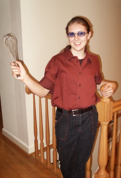 So, one of my friends had the brilliant idea of going as the Fab Five for Halloween. She would be Carson, 3 others would be Jai, Kyan, and Thom, and I would be Ted. For this costume I pretty much raided closets in my house for clothes that were the kind of thing that Ted would wear. I wore my own black jeans with red pinstripes that were Kenneth Cole Reaction, but I had found them at Syms dirt cheap. I'm wearing a black muscle tank under one of my dad's dress shirts that not only matched the pants perfectly, but was the same line of the same designer (Kenneth Cole Reaction). I have no pictures of my feet, but I am wearing red sporty dress shoes with red striped trouser socks. The glasses were the hardest thing to find and I'm still not happy with them, but I found these lightly tinted sunglasses in LA.The belt is my own and I stole the wisk from my kitchen. Since my own hair is halfway down my back, I pulled it into a ponytail at the nape of my neck to achieve a shorter hair look. For trick-or-treating, I had a matching pillowcase and an empty bottle of Vampire wine taken from "Carson"'s house. |