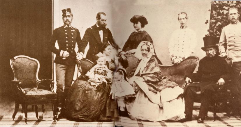 | De izquierda a derecha: de pie, el Emperador Francisco Jos�, Maximiliano, Carlota, Luis Victor y Carlos Luis; sentados, la Emperatriz Elisabeth, la Archiduquesa Sof�a y su esposo el Archiuduqe Francisco Carlos. Los ni�os son el Pr�ncipe Heredero Rodolfo y la Archiuduquesa Gisela, hijos de Francisco Jos� y Elisabeth. (Foto: Raoul Koarty) | ||||||||||||||||
