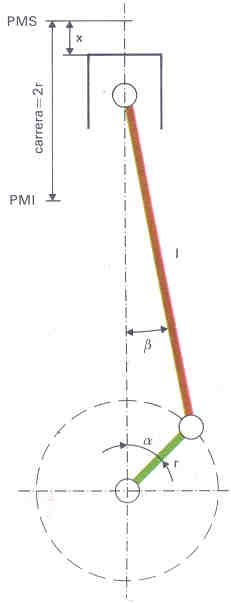| CINEM�TICA Y DIN�MICA DE UNA BIELA El par�metro caracter�stico de la biela es su longitud La longitud de la biela es muy importante para definir el movimiento del pist�n. El desplazamiento X correspondiente a una rotaci�n a que depende tambi�n de la longitud l de la biela: |