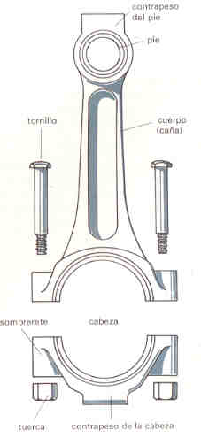 | Aunque es una sola pieza en ella se diferencian tres partes pie, cuerpo y cabeza, el pie de la biela es el que la une al pist�n por medio del pasador o bul�n, el cuerpo asegura la rigidez de la pieza y la cabeza gira sobre el codo del cig�e�al y est� dividido en dos partes una superior y la otra inferior, que aunque en su fabricaci�n se hace en la misma fundici�n o forja se divide para que se pueda asegurar al cig�e�al por medio de esp�rragos o tornillos. Generalmente las bielas est�n perforadas, es decir, se les crea un conducto por donde circula el aceite bajo presi�n desde la cabeza hasta el pasador, con el fin de lograr una buena lubricaci�n. La biela es uno de los elementos del motor que esta sometida a mayores esfuerzos y sobre todo a los de tracci�n, por esta raz�n es importante conocer y comprender su comportamiento tanto cinem�tico como din�mico. |