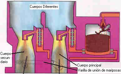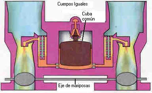 | Por otra parte, los carburadores tambi�n pueden ser clasificados seg�n la cantidad de los conductos y los difusores, encontrando carburadores monocuerpo, que tienen un solo conducto y un solo difusor, o pluricuerpo, siendo los mas normales de doble y de cuatro cuerpos. En la figura se muestran dos tipos de carburadores de doble cuerpo, al lado izquierdo uno de funcionamiento simultaneo, es decir, sus bocas abren al mismo tiempo y al lado derecho de funcionamiento secuencial. | ||||||||||||||||||||||||||||||||||||||||||||||||||||||||||||||||||||||||||||||||