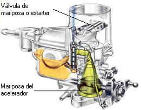 | Cuando el motor est� fr�o y se intenta arrancar, el comportamiento de la gasolina es muy diferente que cuando ya esta caliente, al encontrarse fr�a la gasolina sus fuerzas de cohesi�n son mayores, agregando a esto que no existe corriente de aire en el conducto de admisi�n en la posici�n del surtidor y la gasolina se encuentra en reposo en la cuba. Para esto se enriquece la mezcla, disminuyendo al entrada de aire por medio de una v�lvula de mariposa, conocida como estarter o shock; la cual puede ser accionada mec�nicamente o por censores electr�nicos . |