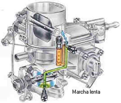 | Se conoce el ralent� como el funcionamiento del motor en marchas m�nimas, es decir cuando no se acelera. En este caso la mariposa del acelerador se encuentra casi cerrada y por tal raz�n el conducto no estrangulado se encuentra bajo la acci�n de la depresi�n y obtiene el combustible por medio de un surtidor especial, llamado "de marcha lenta" (en verde en la figura). Este desemboca delante de la mariposa de aceleraci�n y �nicamente suministra gasolina cuando est� cerrada; al abrirse, la depresi�n sobre este surtidor disminuye hasta el punto en que no es suficiente para aspirar. | ||||||||||||||||||||||||||||||||||||||||||||||||||||||||||||||||||||||||||||||||